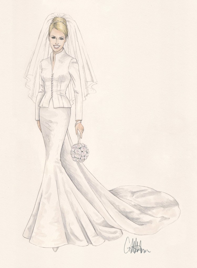 This illustration of Carola’s gown (the Victorian gown with a longer, flower-less train) is done in pencil and gouache on paper and is 11″ x 15″.